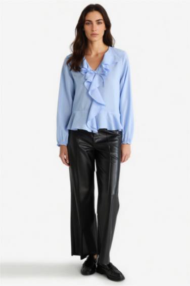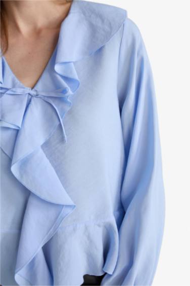 Regular Fit V Yaka Modal Volanlı Uzun Kollu Bluz