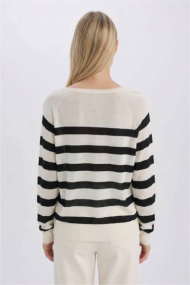 Regular Fit Kayık Yaka Çizgili Triko Kazak