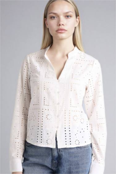 Regular Fıt Kaçık Yaka Brode Uzun Kollu Gömlek