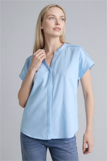 Regular Fıt Bisiklet Yaka Flamlı Pamuk Kısa Kollu Gömlek