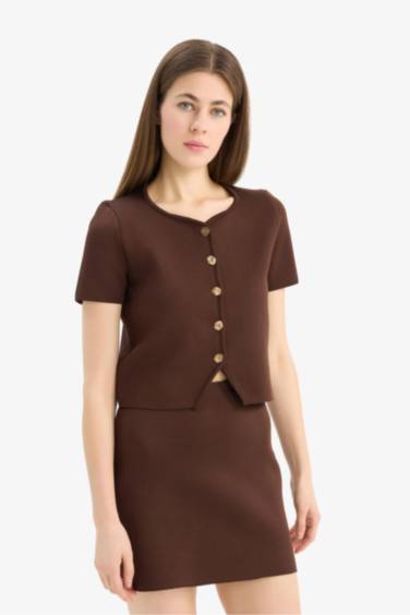 Fitted Bisiklet Yaka Düğmeli Kısa Kollu Triko Hırka