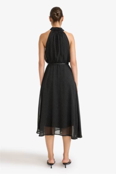 Puantiyeli Bağlamalı Yaka Kemerli Kolsuz Midi Elbise