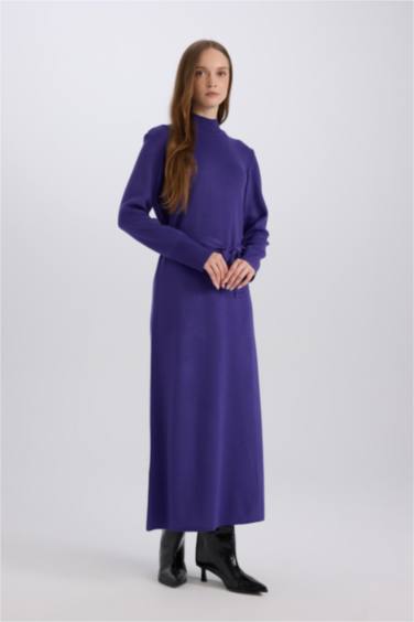 Regular Fit Yarım Balıkçı Yaka Uzun Kollu Bağlama Detaylı Maxi Triko Elbise