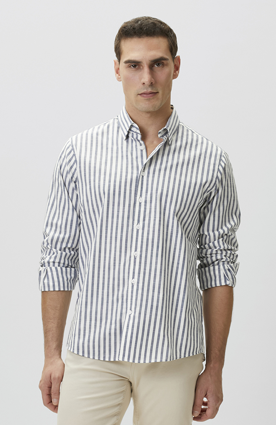 Ekru Mavi Çizgili Keten Gömlek