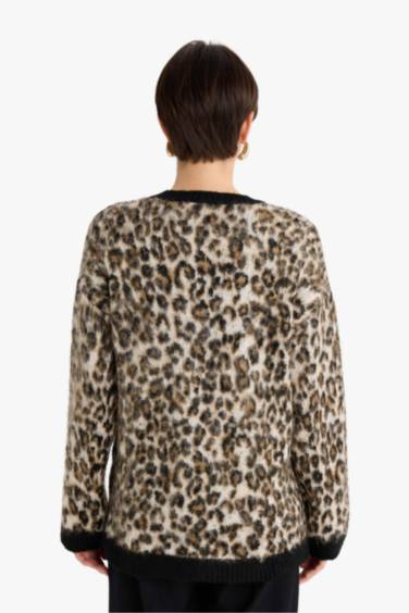 Oversize Geniş Kalıp Bisiklet Yaka Leopar Desenli Triko Kazak