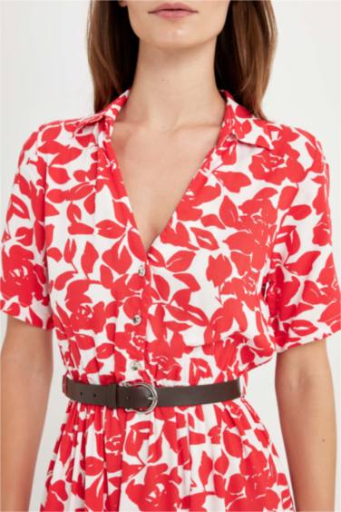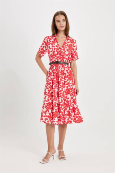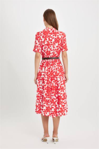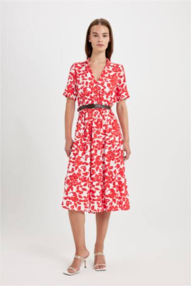 Gömlek Yaka Desenli Kısa Kollu Midi Elbise