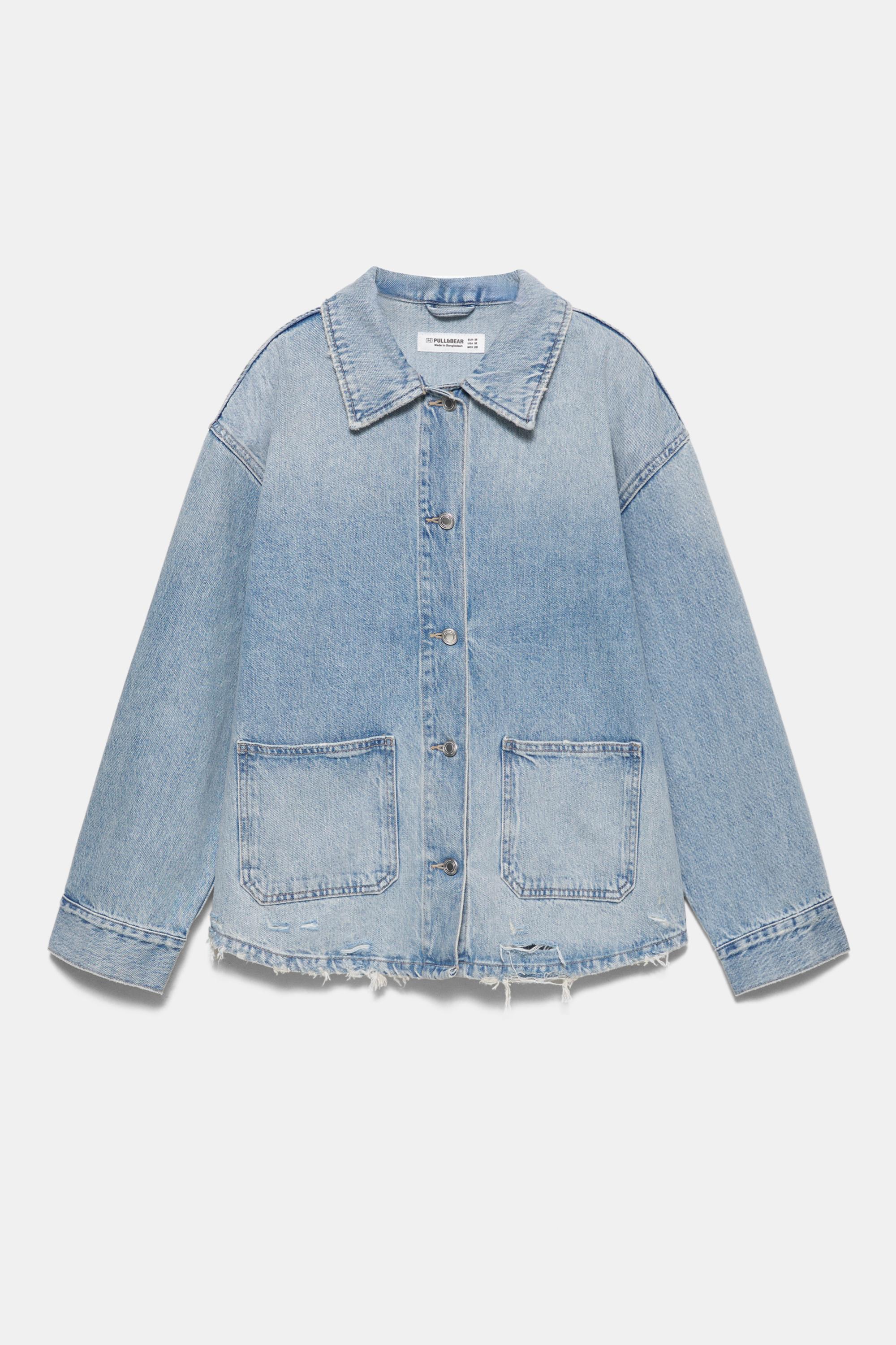 Worker tarzı, önü yama cepli, metalik düğme kapamalı ve pamuklu denim ince ceket.
