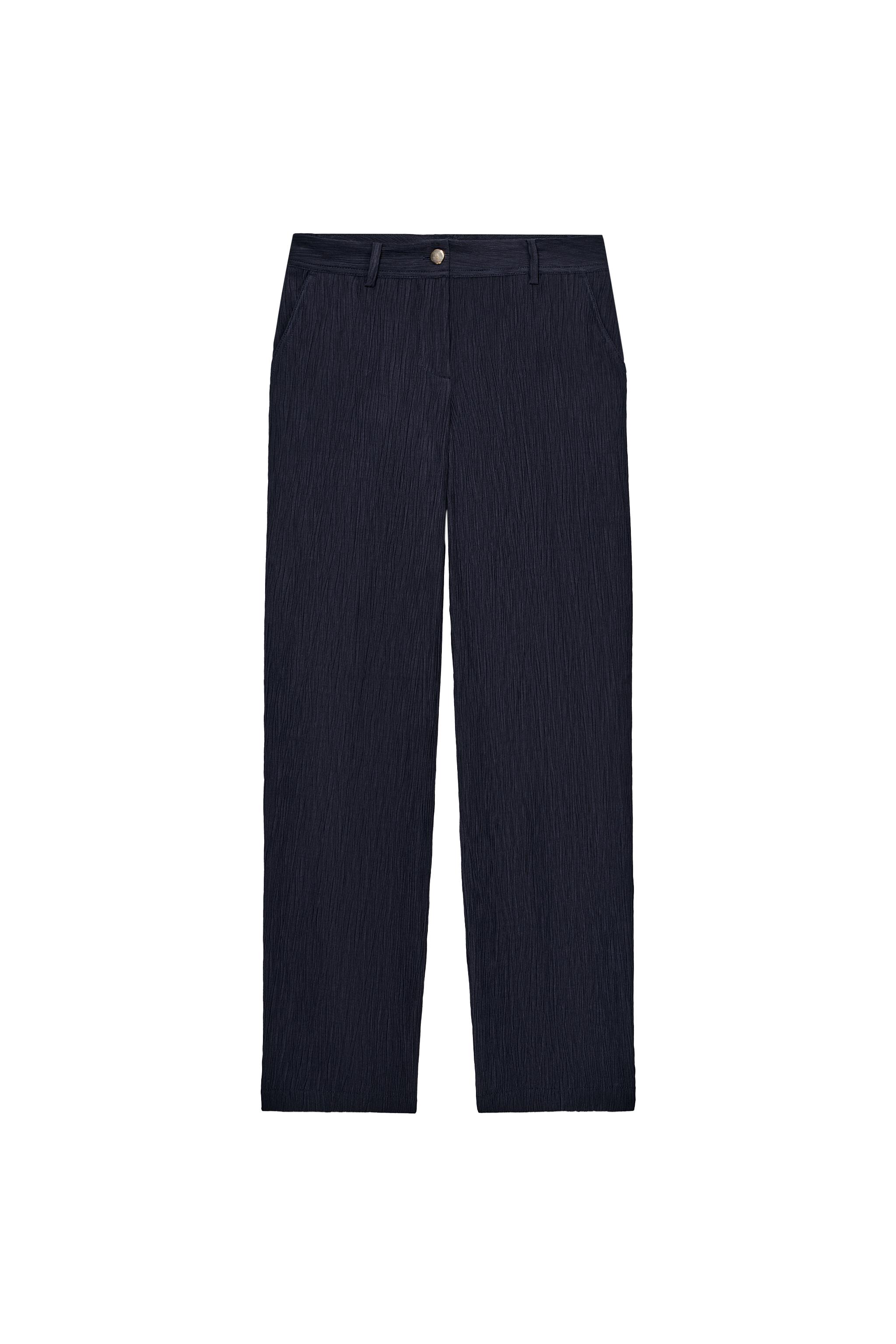 Navy ve siyah renklerdeki kırışık görünümüyle dikkati çeken bu düz paça pantolon, temiz hatlar ve sade detaylarıyla minimalist tarzın en iyi temsilcilerinden biri. Uzun gövdeli tipler için idealdir; uzunluğu vücut hatlarını dengelerken, kalabalık olmayan kesimi şıklığı artırır. Bahar ve sonbahar aylarında ofis-sonrasi bulusmalarda ya da hafif bir yürüyüşte oldukça uygun. Beyaz tisörtle ve yüksek bel jeans ile kombinleme yaparak günlük bir konforlu görünüm elde edebilirsin; aynı zamanda siyah bluzla ve deri topuklu ayakkabıyla daha şık bir hale getirebilirsin. Renk olarak siyahla uyumlu aksesuarlar tercih etmek, overall efektini daha güçlü kılar; örneğin siyah deri kemer ve beyaz sneaker ile tamamlayabilirsin. Düz paça yapısı nedeniyle katlanmadan asmalı, iç katman olarak da kullanılabilir. Klasik ve minimalist bir tarzda sabit kalacak, her mevsimde uygun olacak bir parçadır.