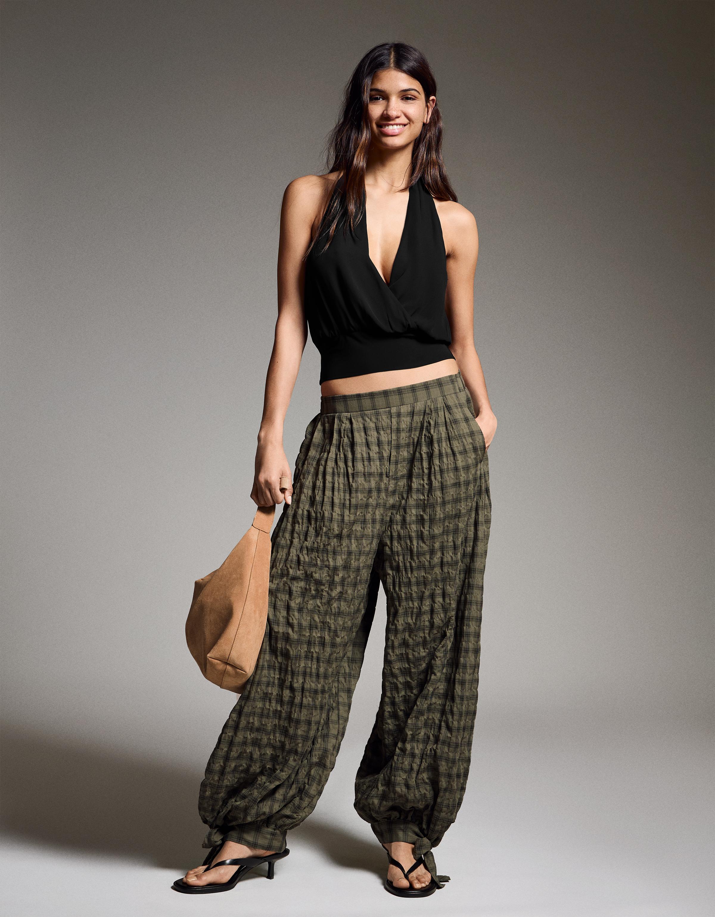 Bershka'nın çapraz halter topu, temiz ve dengeli bir kesime sahip. Uzun govdeli tipler icin idealdir; omuzlara yaslanan kesimi vucudun dengesini saglar. Gündüz saatlerinde ofis-sonrasi bulusmalarda veya kahvaltida rahatca giyilebilir. Kombinleme kolayligi acisindan beyaz tisortle ve yuksek bel jean ile cok etkili bir goz alasti olur. Ayni zamanda gece partilerinde de uygun olabilir; siyah elbiseyle kombinleyerek daha glamoroz bir hale getirebilirsin. Siyah renkli bu top, kemer ve beyaz sneakerle tamamlandiginda hem modern hem de sade bir goz alasti yaratir. Bakim acisindan katlanmadan asmali, iç katman olarak da kullanilabilir. Zaman kazanmak istersen, basit bir bluzla da harika gider.