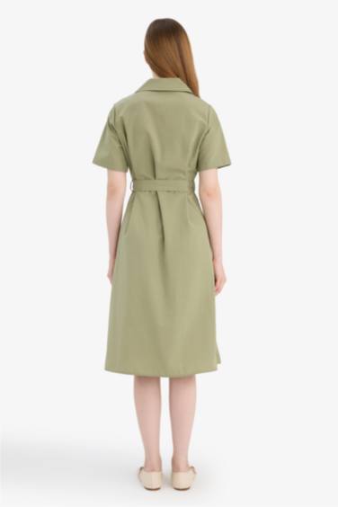 A Kesim Gömlek Yaka Kuşaklı Poplin Kısa Kollu Midi Elbise