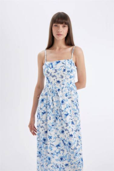 Kare Yaka Desenli Pamuklu Askılı Midi Elbise