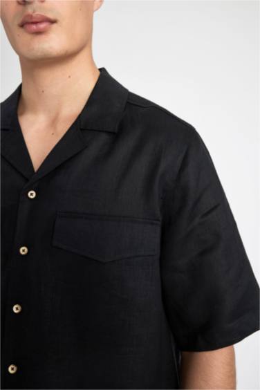 %100 Keten Relax Fit Polo Yaka Yazlık Basic Düz Kısa Kollu Siyah Gömlek