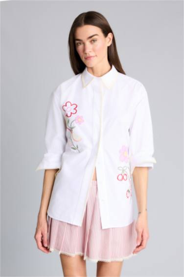 Afra x Defacto Oversıze Nakışlı Poplin Kollu Gömlek