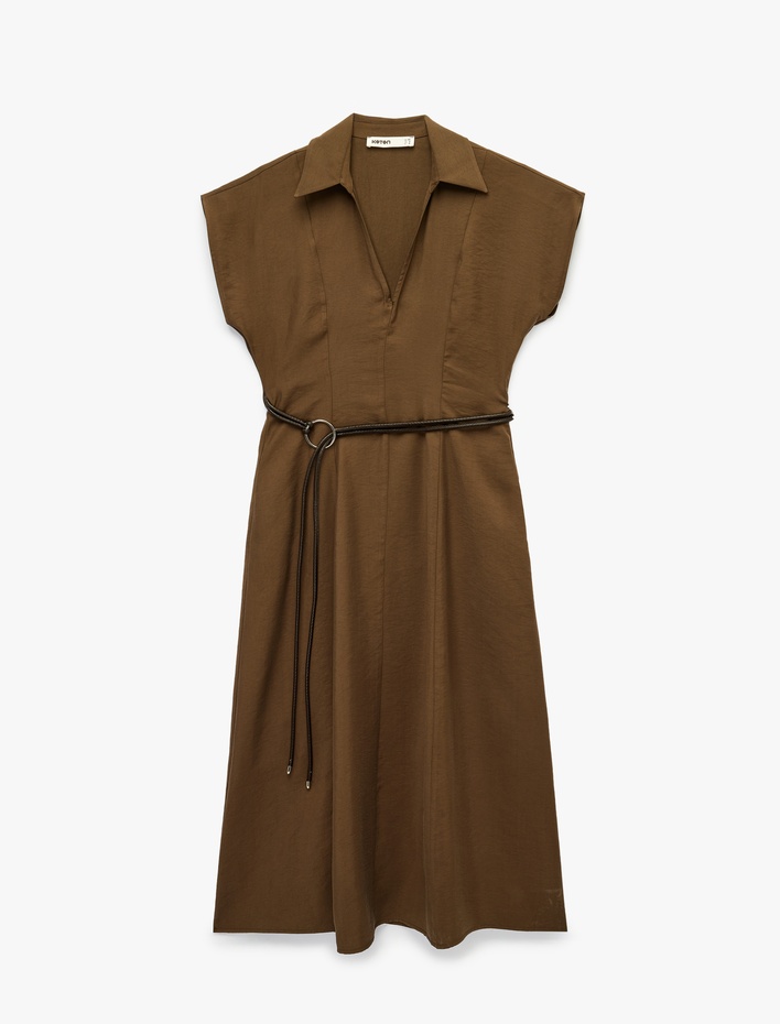 Kap Kol Gömlek Yaka Kemerli Midi Elbise