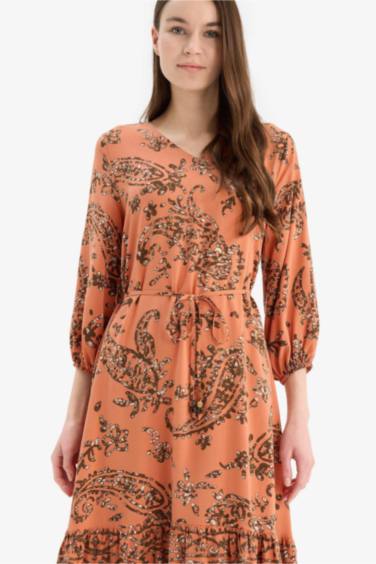 Regular Fit V Yaka Çiçek Desenli Yarım Kollu Midi Elbise