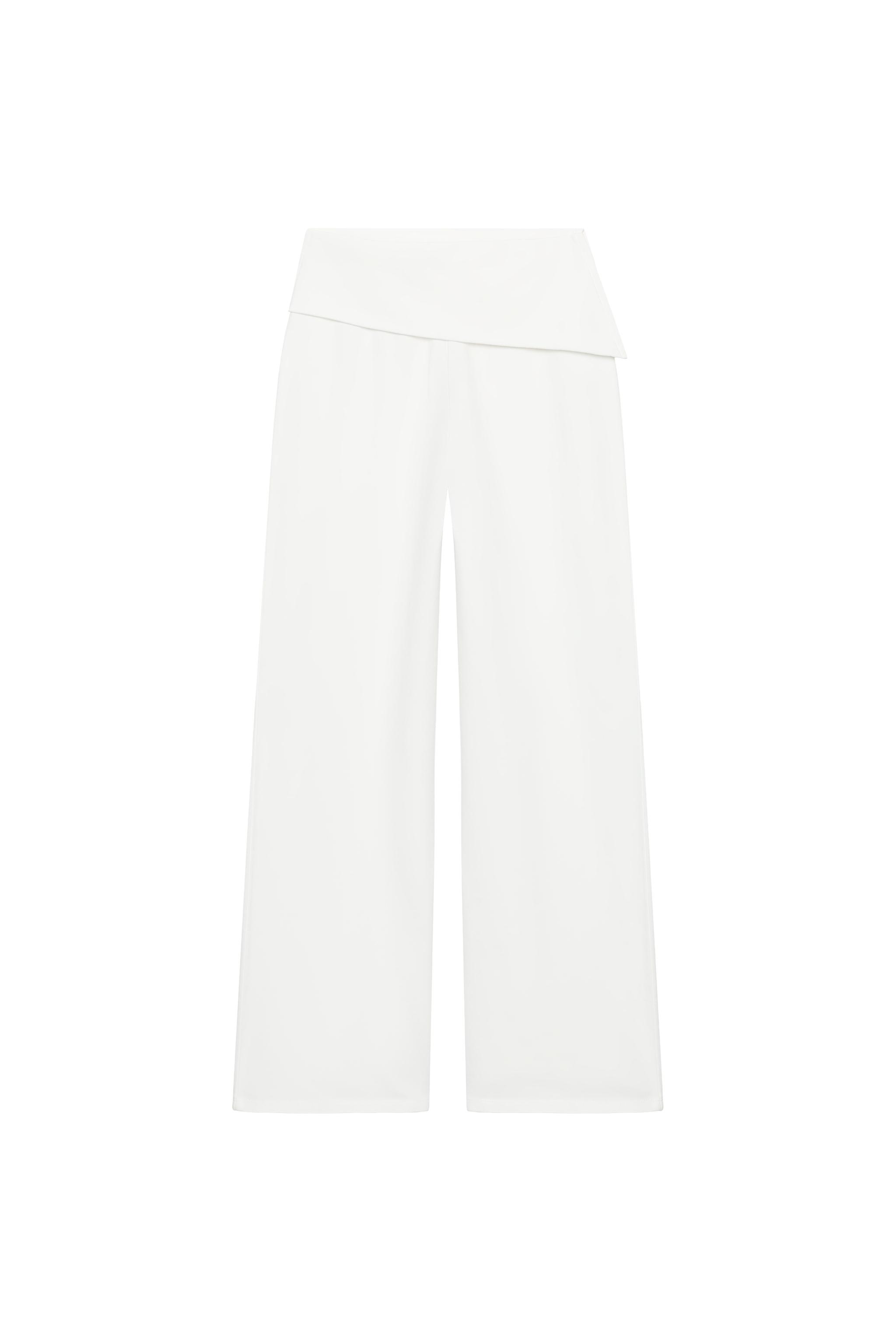Beyaz asimetrik belli pantolon, temiz ve dengeli bir silhuetle dikkat çeker. Daha çok zeminde kalacak şekilde tasarlanmış detayları, her gün giyilebilir bir kıyafet haline getirir. Uzun gövdeli tipler için idealdir; omuzların dengesini bozmadan vücut hatlarını netleştirir. Bahar ve sonbahar aksam yürüyüşlerinde, ofis sonrası buluşmalarda veya rahat bir haftasonu kombininde harika görünür. Beyaz tisörtle ve yüksek bel jeans ile kombinleme yaparak gündelik bir hava yaratırken, aynı zamanda açık yakalı bluzla da daha şık bir look oluşturabilirsin. Siyah deri kemer ve beyaz sneaker ile tamamlayarak minimalist bir estetik elde edersin. Katlanmadan asmali, iç katman olarak da kullanılabilir. Giyim tarzında sadece az parçayla etki yaratmak isteyenler için mükemmel bir seçimdir.