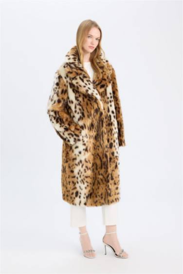 Relax Fit Leopar Desenli Ceket Yaka Cepli Uzun Suni Kürk Kaban