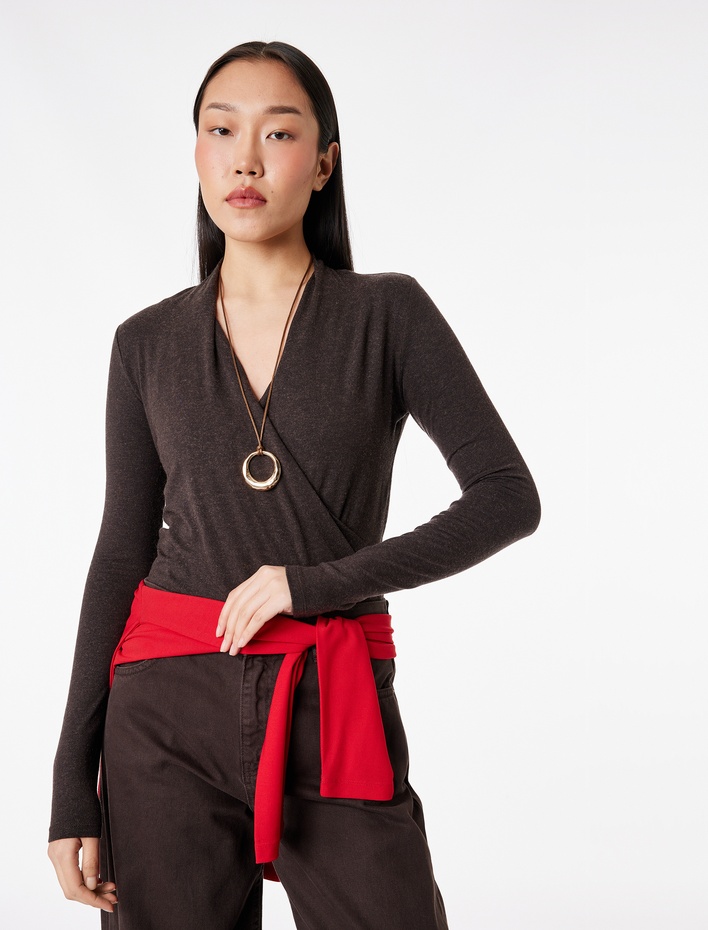 Koyun Yünü Karışımlı Uzun Kollu Slim Fit Kruvaze V Yaka Bodysuit