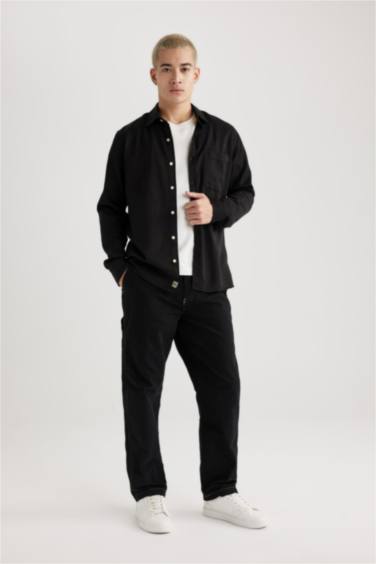 Regular Fit Polo Yaka Pamuklu Uzun Kollu Siyah Gömlek