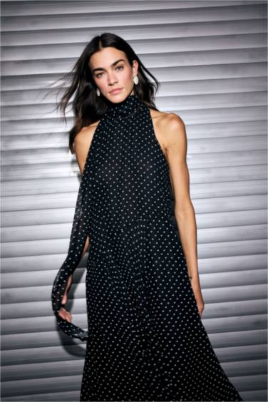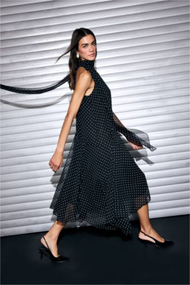 Degaje Yaka Puantiyeli Şifon Midi Elbise
