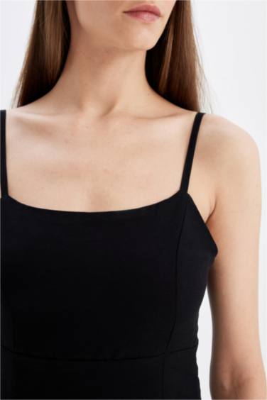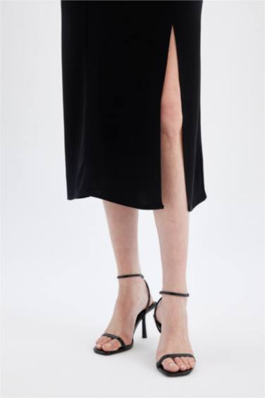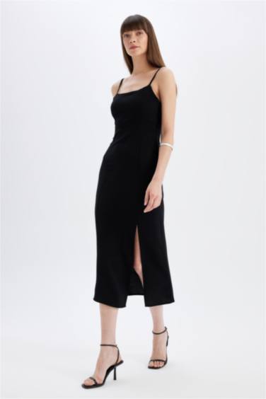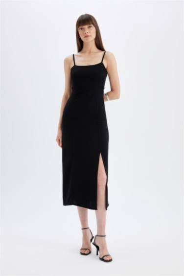 Kare Yaka Keten Karışımlı Yırtmaçlı Askılı Midi Abiye Elbise