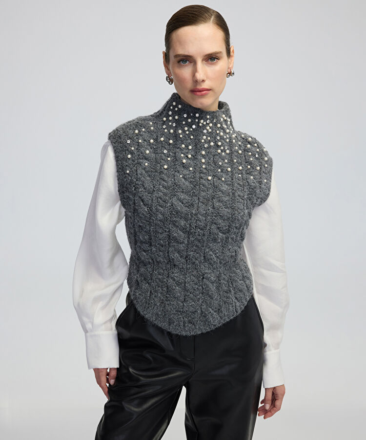 Süveterin hafif karması ve dikkat çekici aksesuarları, temiz bir konsepti birbirine dahil ediyor. Uzun govdeli tipler icin ideal bir secim; omuz hizasinda kesimle vucudun dogru orantilarini koruyor. Beyaz tisortle ve yuksek bel jean ile kombinleme, rahat ama yarim formel bir gozukmeye olanak tanirken, siyah deri kemer ve beyaz sneaker ile tamamlayabilirsin. Kombinasyonu daha da zenginlestirmek istersen, koyu gri bir pantolonla klasik bir ofis-sonrasi bulusmasi olusturabilirsin. Gecen mevsimlerde kalin bir kazak altina veya cok ince bir bluzun ustune katman olarak giyilebilir. Katlanmadan asmali, nemli ortamlardan uzak tutmali. Her zaman kullanilabilir bir parca olan bu süveter, sadece giyim deil, stil anlayisinin da sembolu olabilir.