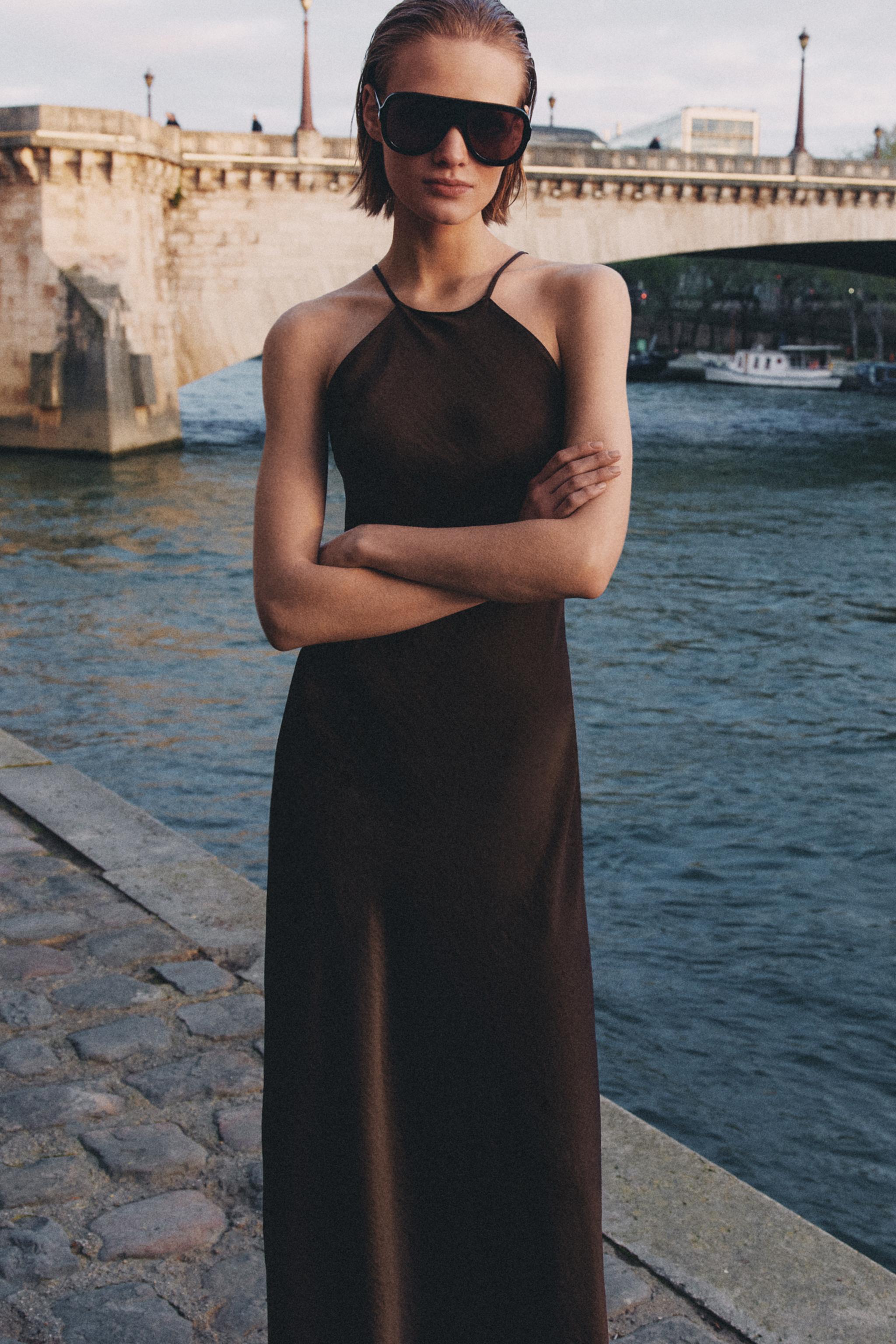 Bu halter saten elbise, temiz ve etkileyici bir dengede kalan minimalist bir tarzın en iyi örneğidir. Sadece bir parça ile dikkat çekmek isteyenler için idealdir. Uzun gövdeli tipler için özellikle uygun olup, bel kısmında sıkı oturan kesimi vücut hatlarını net bir şekilde ortaya koyar. Gecelik toplantılar veya özel gece yürüyüşleri gibi raffine ortamlarda çok etkili bir görüntü sunar. Beyaz tisörtle ve yüksek bel jeans ile gündüzden geceye geçiş yapabilirsin; aynı zamanda siyah deri kemer ve beyaz sneaker ile daha rahat bir hale getirebilirsin. Koyu tonları sayesinde her mevsimde kullanışlıdır; özellikle sonbahar ve kış aksamında daha da şık görünür. Giyildiği zaman içindeki kumaşın dokusu hissedilir; bu yüzden asılı tutulması ve katlanmaması önerilir. İç katman olarak da kullanılabilir, hem rahat hem de zarif bir look oluşturur.