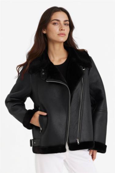 Regular Fit Suni Kürk Astarlı Fermuarlı Suni Deri Ceket Mont