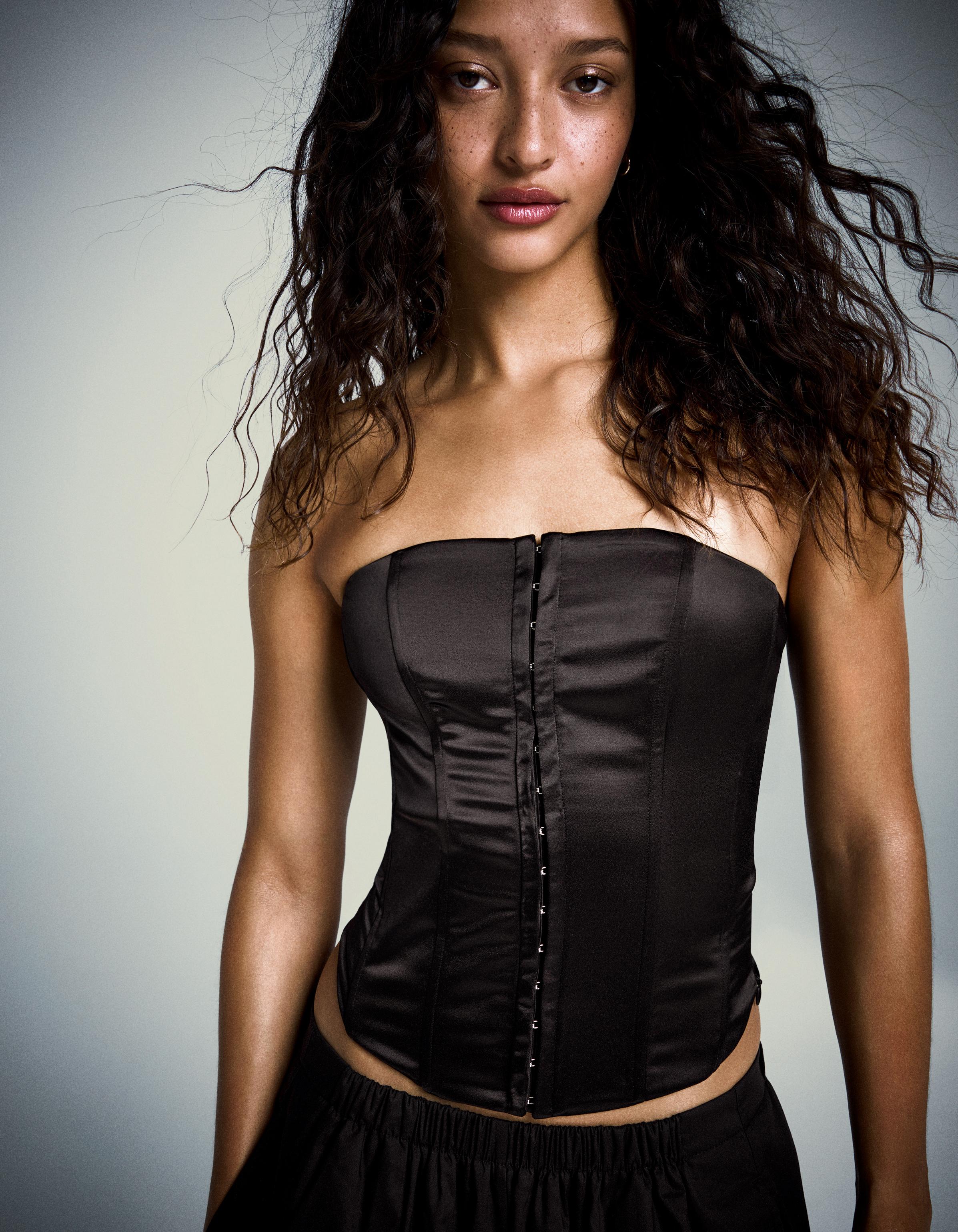 Saten büstiyer top, temiz ve klasik estetikle dikkat çeken bir parçadır. Kaskatı yapısı, vücut hatlarını hafifçe vurgulayarak zarif bir görünüm sunar. Uzun gövdeli tipler için idealdir; omuz çizgilerini dengeliyor ve genis omuzlari dengelemek için de iyi bir seçimdir. Yazın açık havada veya sonbaharda yuruyüşlerde, ofis-sonrasi bulusmalarda ya da sade bir akşam yemeğinde rahatça giyilebilir. Beyaz tisortle ve yuksek bel jeans ile kombinleme, günlük bir kombine oluştururken, siyah deri kemer ve beyaz sneaker ile tamamlayabilirsin. Sadece bir renk olan siyah, farklı aksesuarlarla çok yönlü bir stil sunar. Bakım açısından katlanmadan asmali, iç katman olarak da kullanılabilir. Zaman kazanmak istersen, kolayca bir blouzun altına geçebilirsin.