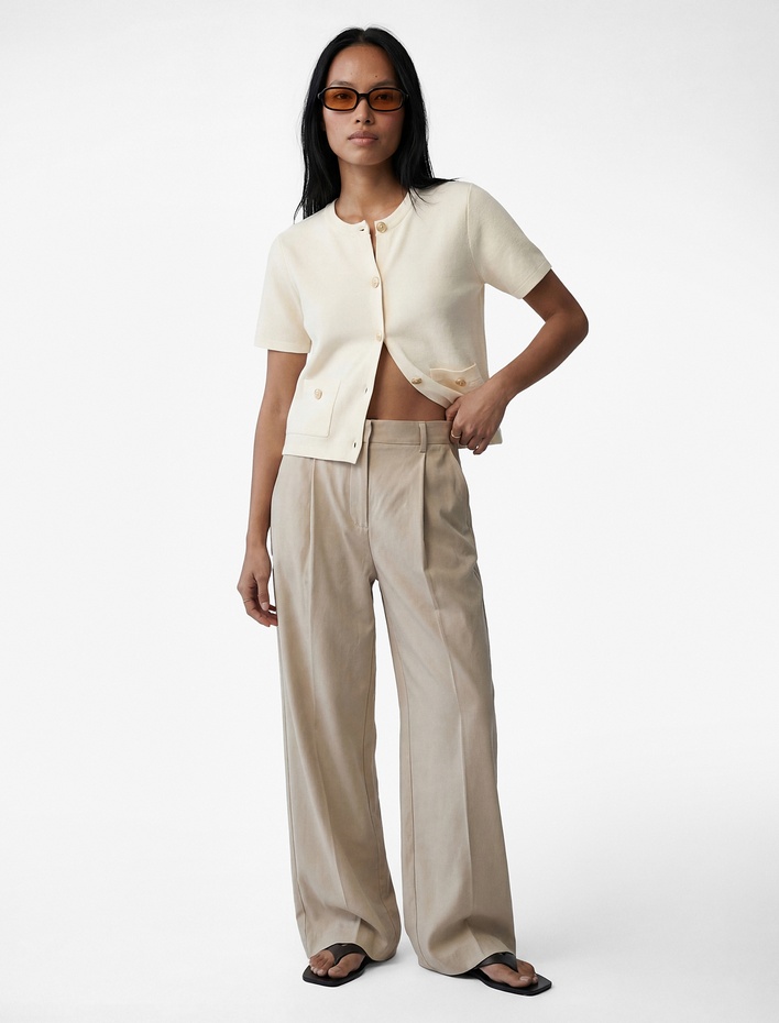 Bu koton hırka, temiz ve sade bir estetikle dikkat çeken, günlük yaşamın her anına uyum sağlayabilecek bir parçadır. Cream ve beige tonları, notr ve ılık bir atmosfer yaratır; bu da onu her mevsimin başlangıcında ideal bir seçim yapmaya uygun kılar. Uzun gövdeli tipler için idealdir çünkü vücut hatlarını rahatlatır ve dengeleyici bir etki yaratır. Beyaz tisörtle ve yüksek bel jeans ile kombinleme, gündelik bir görünüm elde etmenizi sağlar; aynı zamanda siyah deri kemer ve beyaz sneaker ile tamamlayarak daha şık bir hale getirebilirsiniz. Diğer bir seçenek ise açık renkli bir pantolonla, bol bir kabanın altına veya kısa bir ceketin içine giymek; bu da sonbahar aksam yürüyüşlerinde veya ofis sonrası buluşmalarda çok etkili olur. Hırkanın dokusu, hem rahat hem de zarif bir his verir; bu yüzden iç katman olarak da kullanılabilir. Kuru temizlik önerilir ve katlanmadan asılması, dokusunu korumada önemlidir.