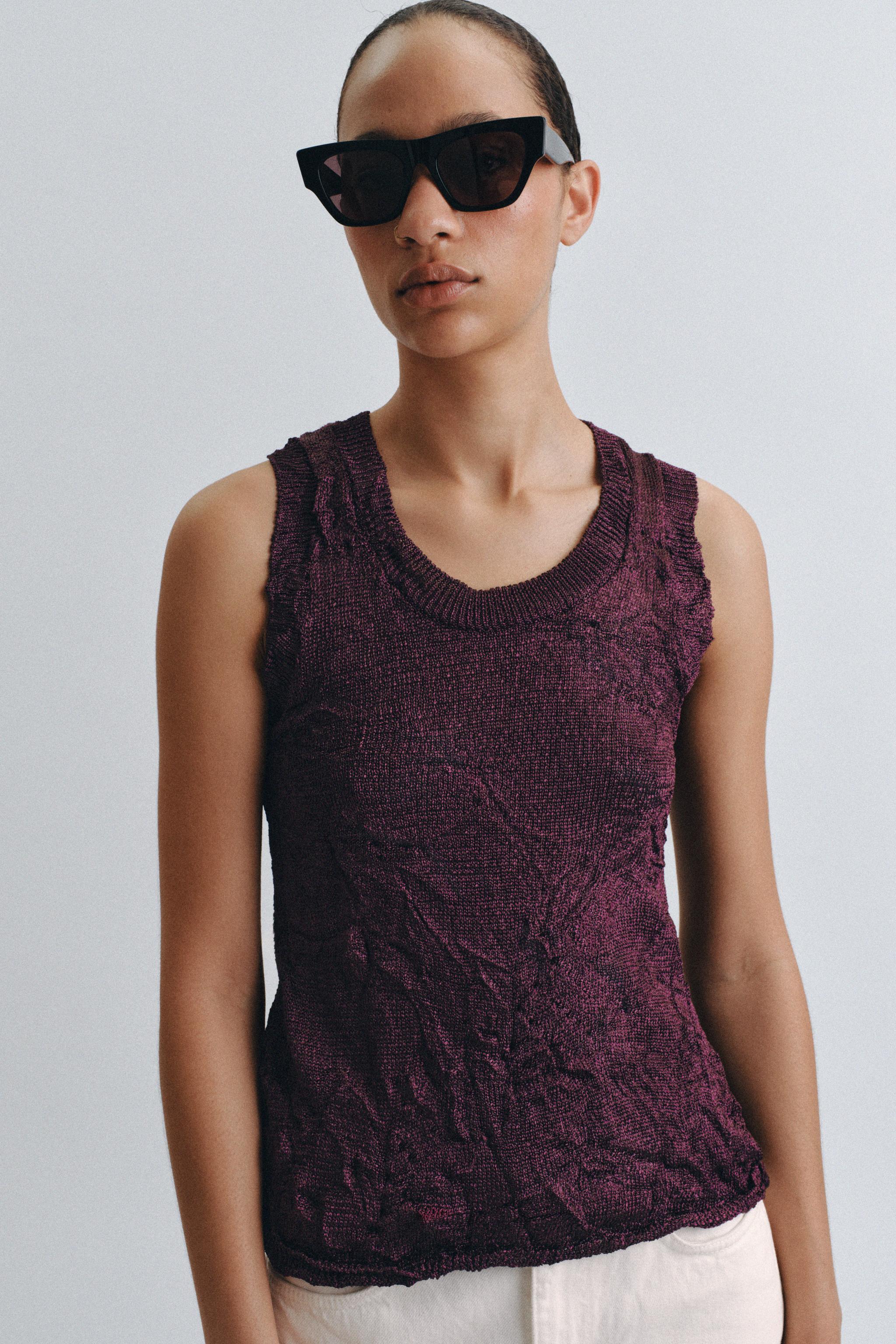 Burgundy ve siyah renklerdeki kırışık görünümü triko top, temiz hatlar ve minimalist estetikle dikkat çeker. Uzun gövdeli tipler için idealdir; vücut hatlarını hafifçe vurgularken rahat bir taşımaya sahip. Klasik beyaz tisörtle ve yüksek bel jeans ile gündüz kombininde oldukça etkili olurken, siyah deri kemer ve beyaz sneaker ile ofis-sonrası buluşmalarda da uygun bir seçenek sunar. Aksamların hafif kıyafet gereksinimlerini karşılamak için burgundy rengi bir pantolonla da harika bir eşleşme sağlar. Kuru temizlik önerilir; katlanmadan asılı tutulması, dokusunu korur. İç katman olarak da kullanılabilir; zaten sade olduğu için her tarzda sorunsuz yer alır.