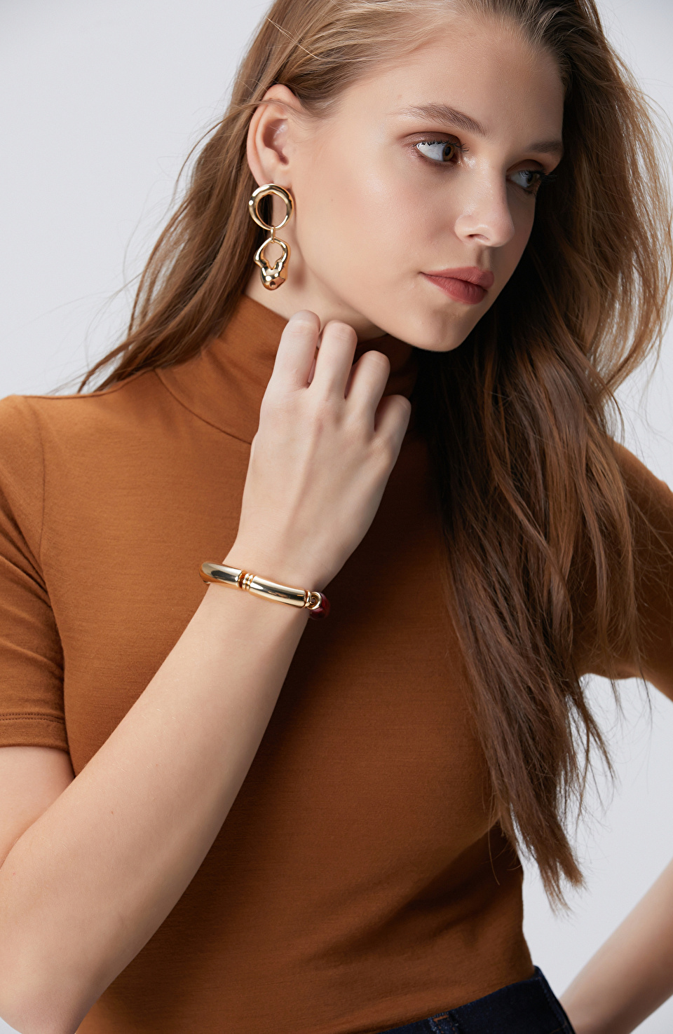 Altın rengi bir bileklik, temiz ve etkili bir aksesuar olarak her zaman dikkat çeker. Network modeli, minimalist anlayışla tasarlanmış olup, sade ama dikkat çekici detaylarla dengelenmiş. Uzun gövdeli tipler için idealdir çünkü omuz hizasında taşınması vücut hatlarını daha dengeli gösterir. Bahar ve sonbahar aksamı yürüyüşlerinde ya da ofis sonrası buluşmalarda şıklığı artırmak için harika bir seçimdir. Beyaz tisörtle ve yüksek bel jeans ile kombinleme yaparsanız hem rahat hem de zarif bir görünüm elde edersiniz. Aynca siyah deri kemer ve beyaz sneaker ile tamamlayarak gün içindeki farklı anlara uygun hale getirebilirsiniz. Bileği katlanmadan asmalı, iç katman olarak da kullanılabilir. Altın rengi parlayan yüzeyi, kırmızı tonlu giysilerle de iyi çakışır. Her zaman dikkat çekmeyi sevenler için mükemmel bir ekledir.