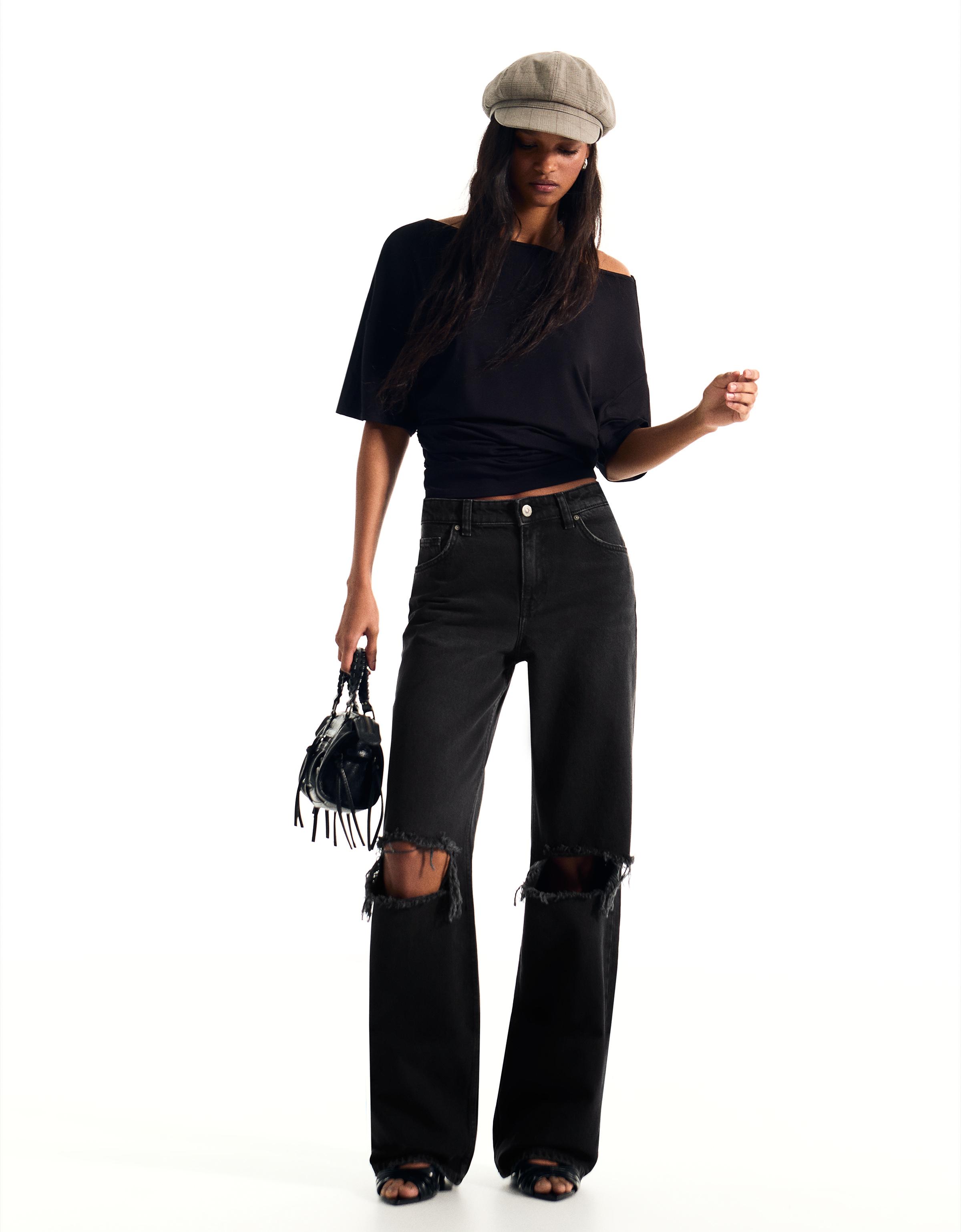Yüksek bel distressed geniş paça jean