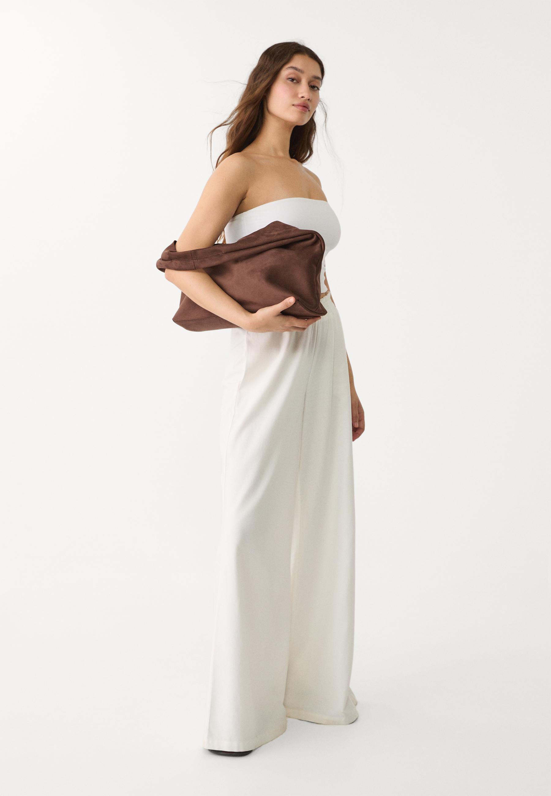 Suni süet omuz çantası, temiz hatları ve minimal detaylarıyla her günün vazgeçilmezini oluşturuyor. Beyaz tisörtle ve yüksek bel jeans ile kombinleme, ofis-sonrasi bulusmalarda da zarif bir hava yaratıyor. Uzun gövdeli tipler için ideal, dengeli bir görünüm sunuyor. Kahverengi model, sonbahar aksam yürüyüşlerinde veya kahve buluşmalarında doğal bir dokunuş sağlıyor. Siyah deri kemer ve beyaz sneaker ile tamamlayarak daha modern bir hale getirebilirsin. Çantayı katlanmadan asmalı, iç katman olarak da kullanılabilir. Klasik ama şıklıkta bir tasarımla, hem günlük hem de özel gece aktivitelerine uygun.