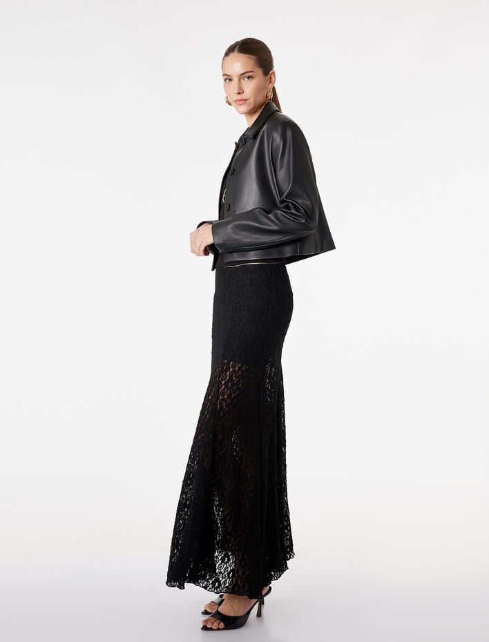 Beyaz tisortle ve yuksek bel jean ile kombinlemeyle sadece bir gunduz kahvaltisi veya ofis-sonrasi bulusmasi icin de uygun hale getirebilirsin. Uzun govdeli tipler icin ideal olan bu etek, omuzlarin hafifce genis olanlara da cok iyi yansir. Siyah rengiyle her zaman kullanilabilir; ayni zamanda siyah deri kemer ve beyaz sneaker ile tamamlayarak daha dinamik bir gozukme olusturabilirsin. Kati olmayan dantel yapisi sayesinde giyim sirasinda katlanmadan asmali tutman yeterli. Daha rafine bir gozukme istersen, beyaz bir bluzun altina koyarak gece yarisi bir toplantisina da uyan bir secim yapabilirsin.