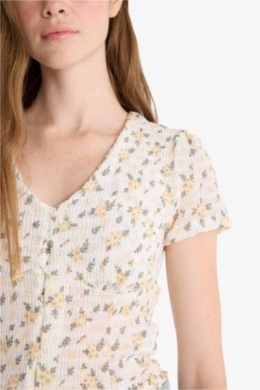 Fıtted V Yaka Çiçekli Dokulu Kısa Kollu Bluz