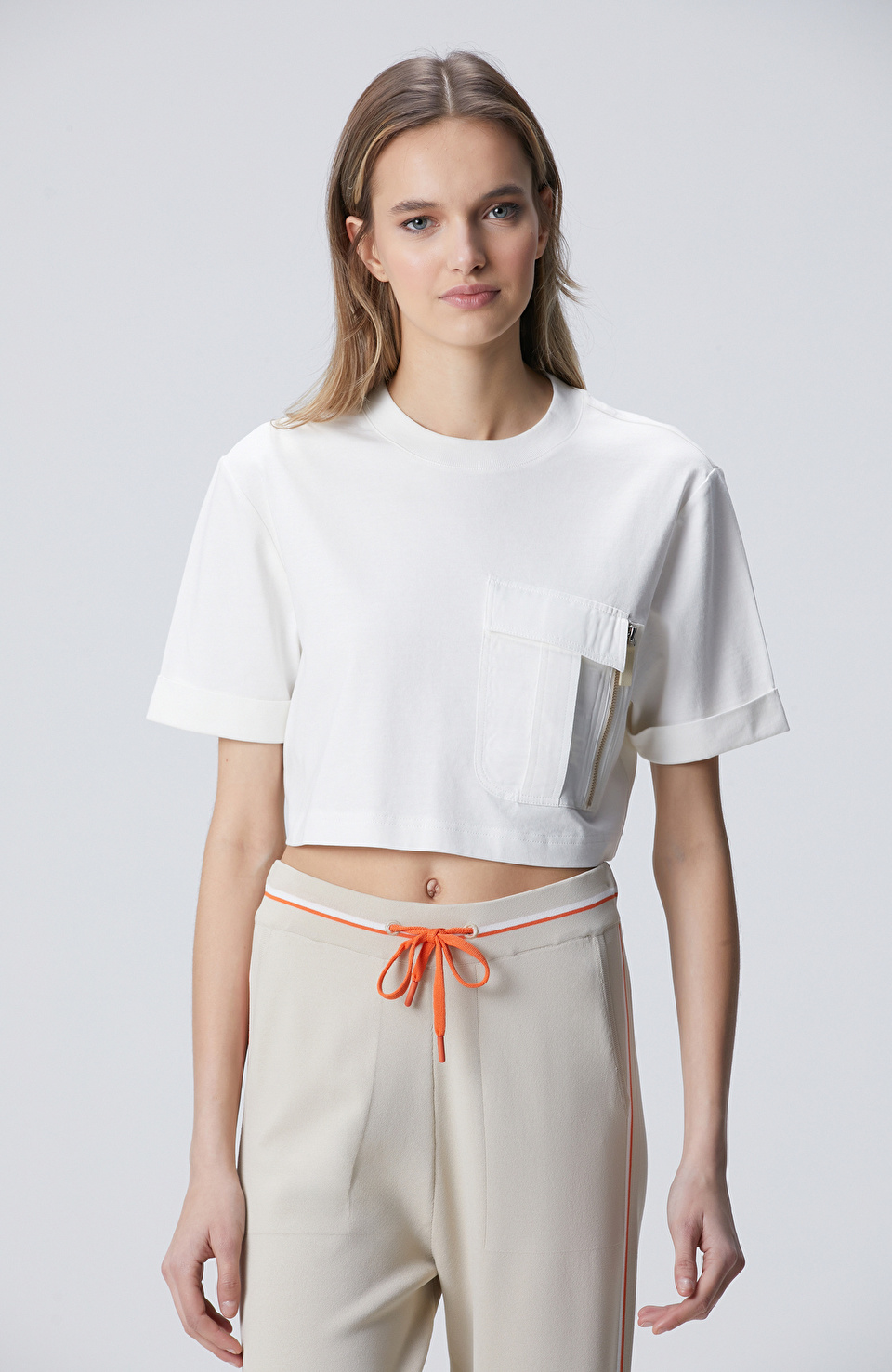 Bu t-shirt, temiz ve dengeli bir estetikle dikkat çeken, sadece birkaç parçayla güçlü bir görüntü yaratabilecek bir parça. Kırık beyaz garni detayları ile klasik t-shirt’in üzerine modern bir dokunuş kattı. Temiz beyaz rengi, her zaman uyum sağlayacak bir temel sunarken, küçük turuncu detaylar da dikkat çekici bir vurgu oluşturuyor. Uzun gövdeli tipler için idealdir; omuz hizasına kadar gelen uzunluğu, vücut hatlarını dengeli şekilde yansıtır. Beyaz tisörtle ve yüksek bel jeans ile kombinleme, günlük şehir gezintilerine veya ofis-sonrası bulușmalara uygun, rahat ama şıklık dolu bir görünüm sunar. Aynı zamanda sportif bir tarzda, gri spor pantolonu ve siyah sneaker ile de oldukça etkili olur. Renk bütünlüğüne dikkat ederek, siyah deri kemer ve beyaz sneaker ile tamamlayabilirsin. Bu t-shirt, katlanmadan asılı tutulmasıyla daha uzun ömürlü olur; aynı zamanda iç katman olarak da kullanılabilir. Her mevsimin vazgeçilmezlerinden biri olmaya aday.