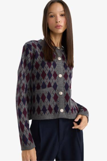 Regular Fit Bisiklet Yaka Baklava Desenli Düğmeli Triko Hırka