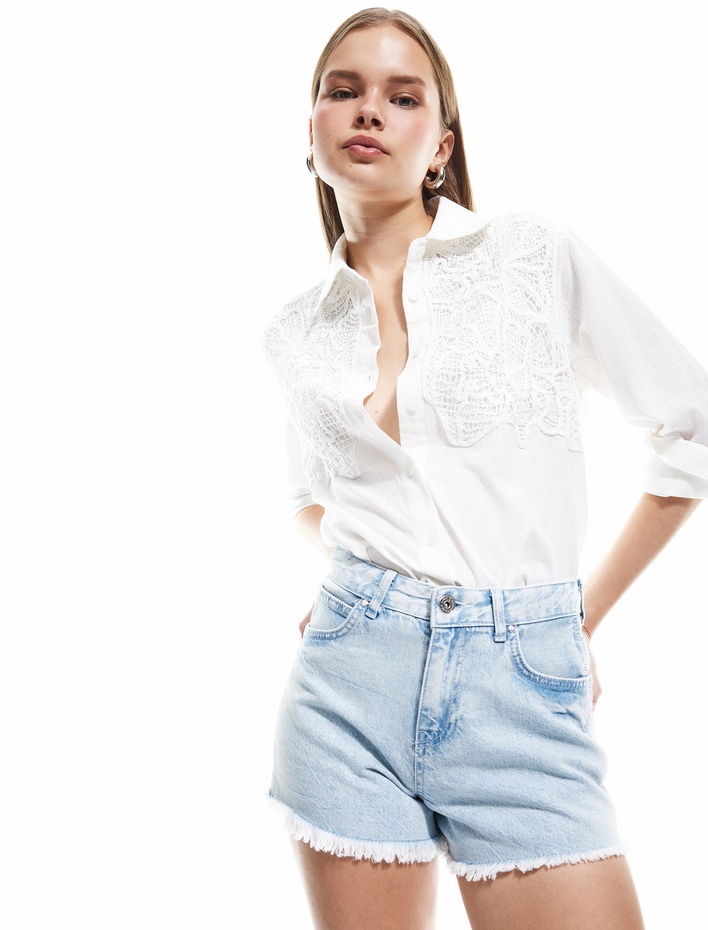 Bu koton dantel detaylı gömlek, temiz ve sade bir estetikle dikkat çeken bir parçadır. Beyaz veya açık mavi tonlarında sunulan bu gömlek, minimalist anlayışa uygun olarak sadece gerekli detayları içeriyor. Uzun kollu ve klasik yaka yapısıyla hem rahat hem de zarif bir görünüm sunuyor. Keten karışımlı dokusu sayesinde hafif ve hava altyapılı bir his veriyor. Uzun gövdeli tipler için idealdir çünkü gövde uzunluklarını dengeleyen bir yapıya sahiptir. Geniş omuzlara sahip olanlar için ise etekle veya pantolonla kombinlemeyle dengelenmesi önerilir. Yaz ve ilkbahar aylarında günlük kullanım için harika bir seçimdir; aynı zamanda tatil zamanlarında da şık bir konfor sağlar. Beyaz tisörtle ve yüksek bel jeans ile kombinleme, casual bir tarz oluştururken, açık mavi gömleği siyah bir etekle giymekse daha şık ve ofis-sonrası bir hava yaratır. Siyah deri kemer ve beyaz sneaker ile tamamlayarak modern bir touch ekleyebilirsin. Dantel detayını vurgulamak için küçük küpe veya ince bir bileklik de tercih edilebilir. Kurutma sırasında katlanmadan asılması, dokusunu korumak açısından önemlidir. Aynı zamanda iç katman olarak da kullanılabilir; özellikle serin günlerde blazer ya da hafif bir ceketle birlikte giyilebilir.
