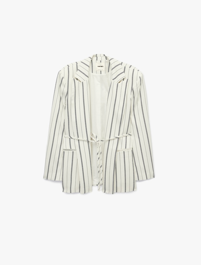 Uzun Kollu Cepli Beli Bağlama Detaylı Çizgili Blazer Ceket