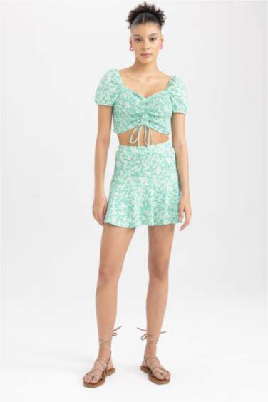 Slim Fit Dar Kesim Crop Desenli Büzgü Detaylı Kısa Kollu Bluz