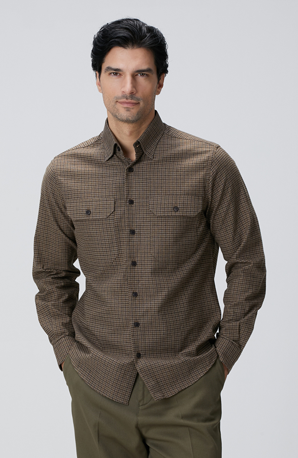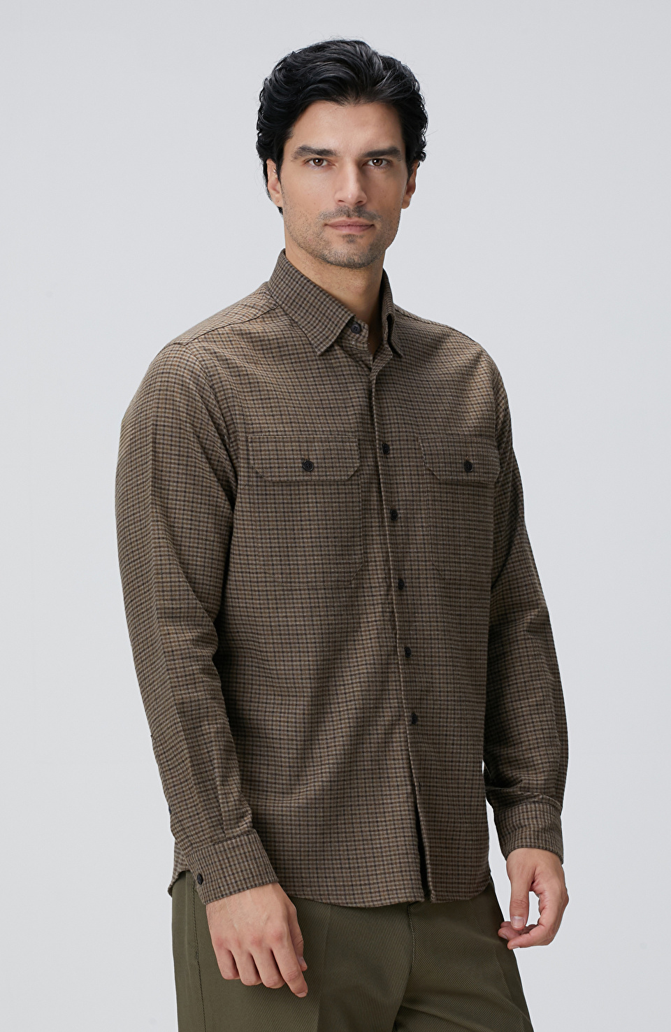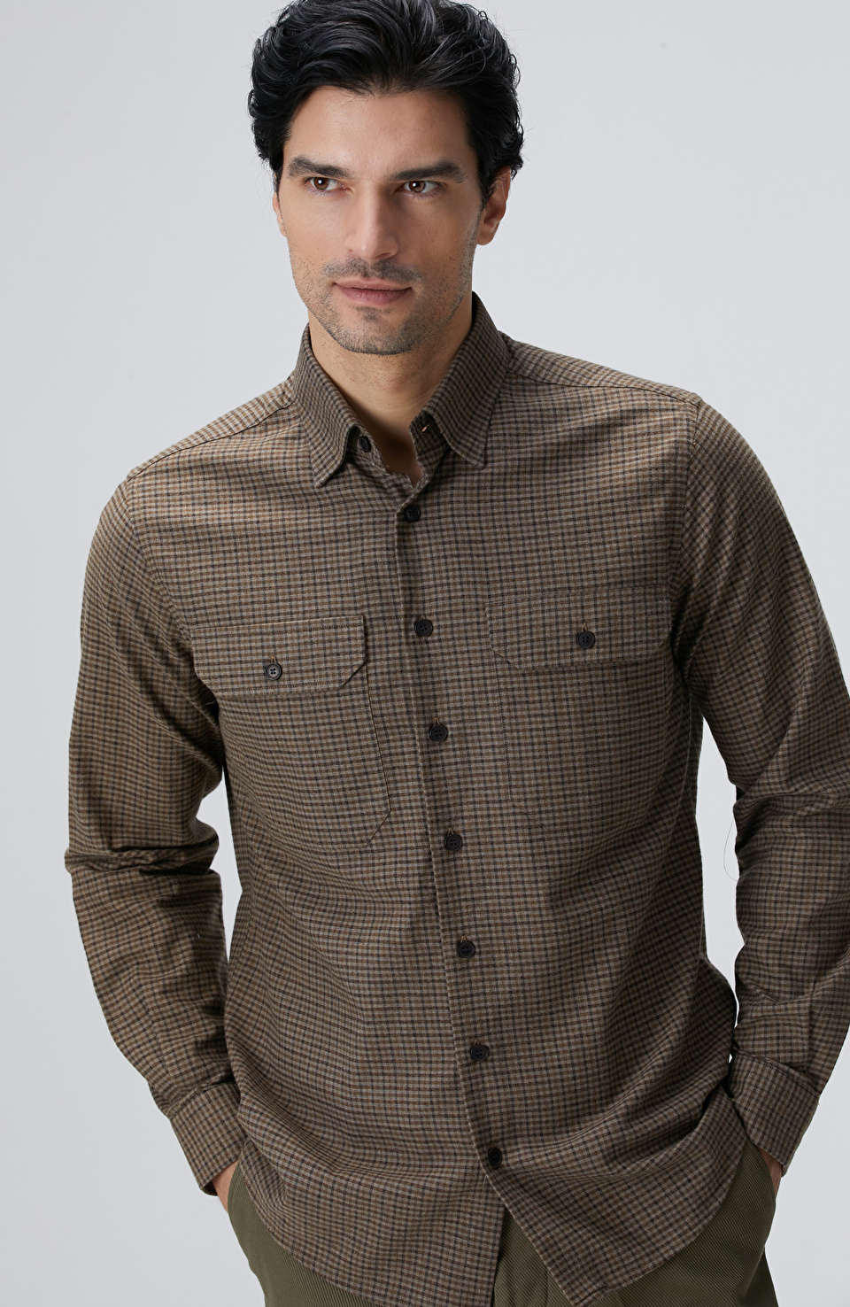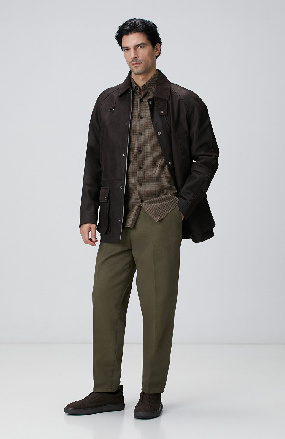 Brown-tonlu **Kumaş mix colorblock gömlek**, burgundy **Belden bağlamalı wide leg fit pantolon** ve brown **Suni deri babuç** ile dengeli, rahat ama etkili bir kombin.
