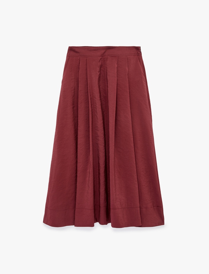 Burgundy ve deep red tonlarında sunulan bu pileli midi etek, temiz ve sade bir estetikle dikkat çeker. Klasik ve rahat kalıp ile tasarlanan bu etek, vucudunuzu hafifçe sararak zarif bir hat ortaya koyar. Uzun govdeli tipler icin idealdir; hem uzunluk oranini dengeleyip hem de hafif bir dengesi yaratir. Yazın ofis-sonrasi bulusmalarda veya sonbahar aksam yuruyuslerinde, klasik bir beyaz tisortle ve yuksek bel jean ile kombinlenebilir. Ayni zamanda, cok hafif bir bluzla veya bol bir kot ceketin icine giyilerek daha serin bir kombine yaratabilirsin. Siyah deri kemer ve beyaz sneaker ile tamamlandiginda, klasik bir modern his verir. Daha ziyade esnek bir kullanim icin katlanmadan asmali, iki katli olarak da giyilebilir. Sadece koton ve modal kumaş yapisi sayesinde hafif ve rahat bir dokusu vardir.
