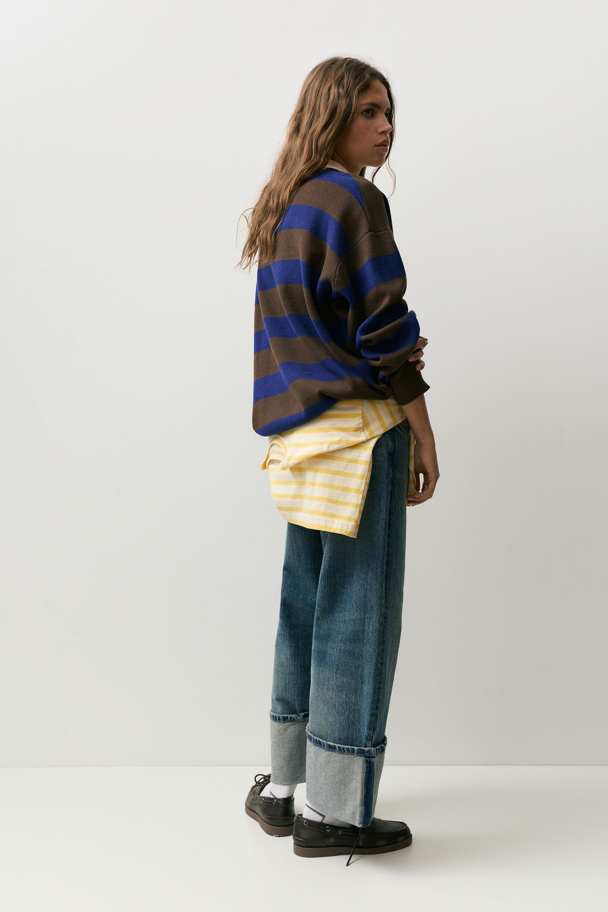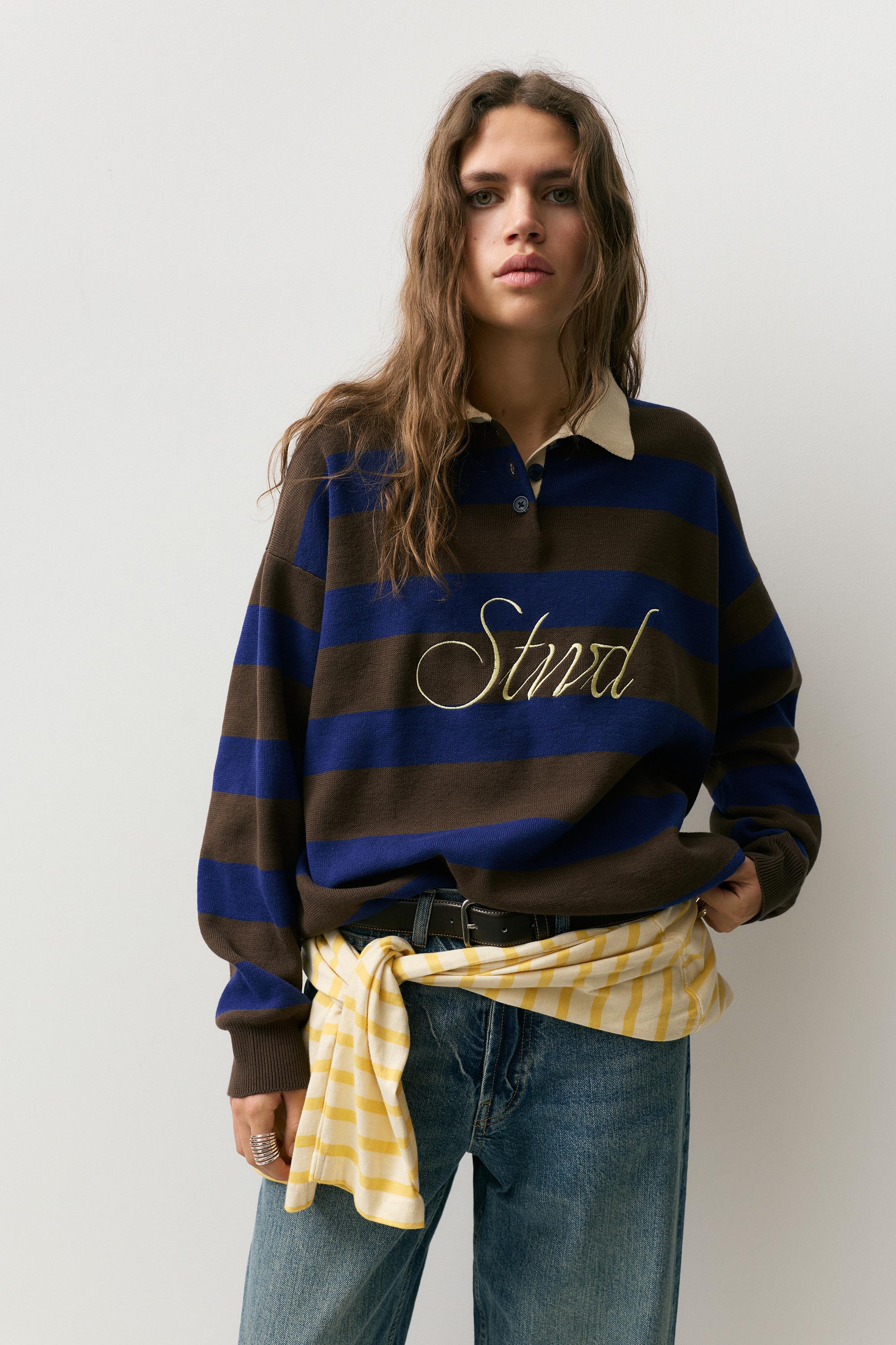 Çizgili tasarımlı, STWD logolu ve kontrast yakalı, uzun kollu örgü polo.
