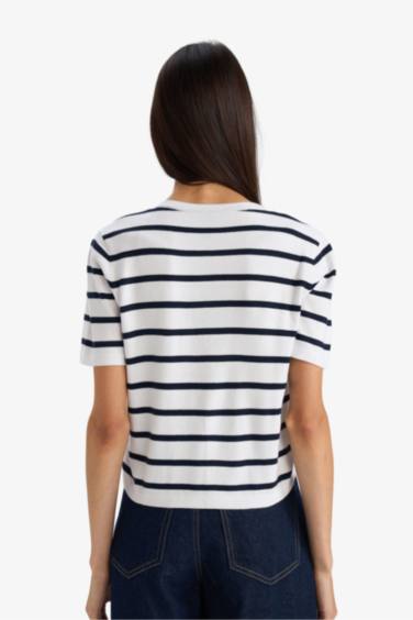 Regular Fit Bisiklet Yaka Çizgili Kısa Kollu Triko Hırka
