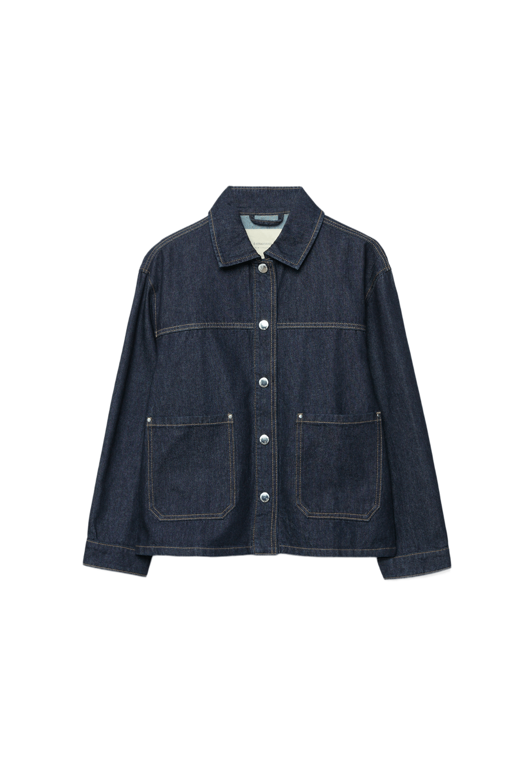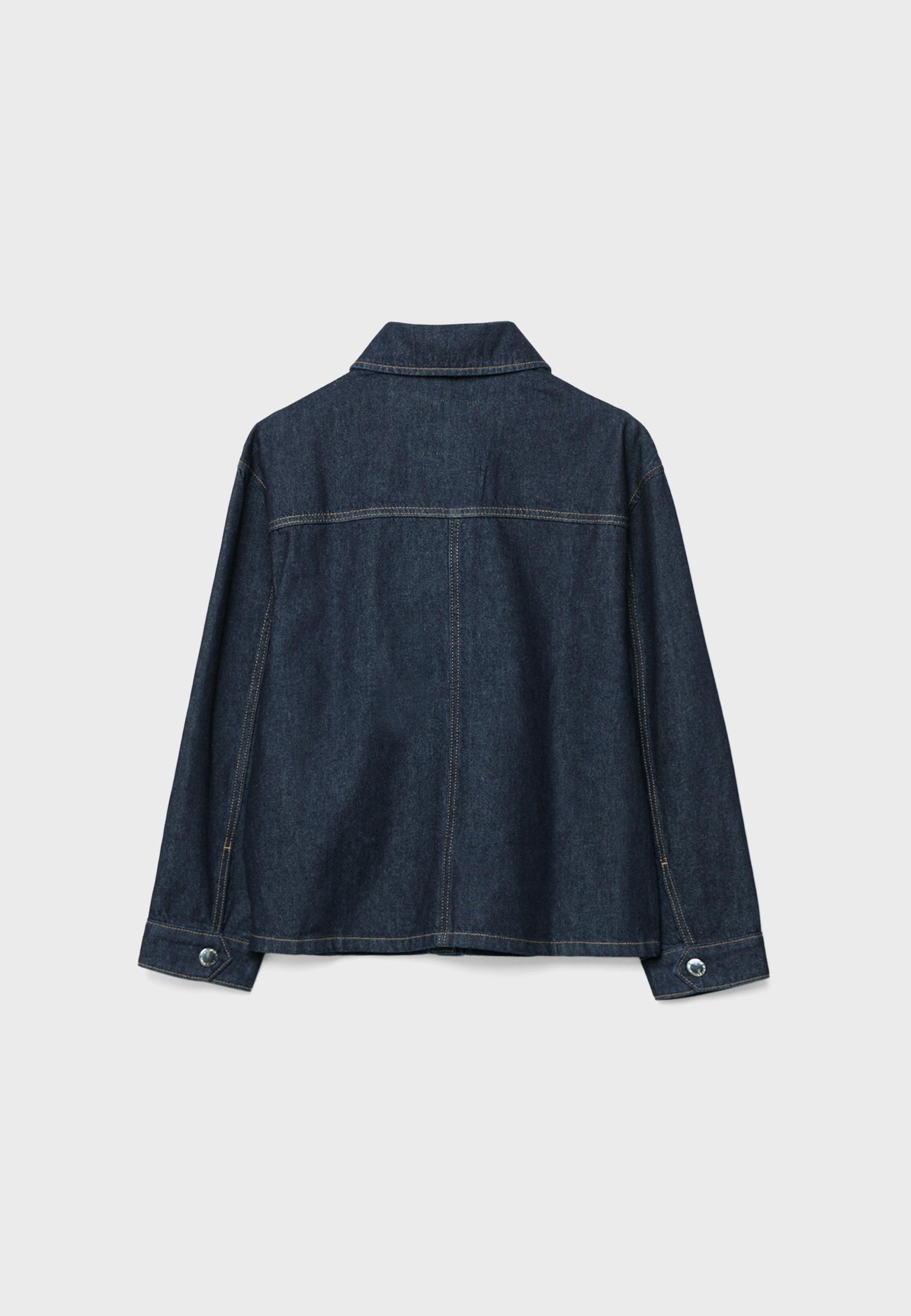 Düğmeli manşetlerle tamamlanan uzun kollu, yakalı kot ceket. Ön kısımda yama cep detayları. Metal çıtçıtlı ön kapama.