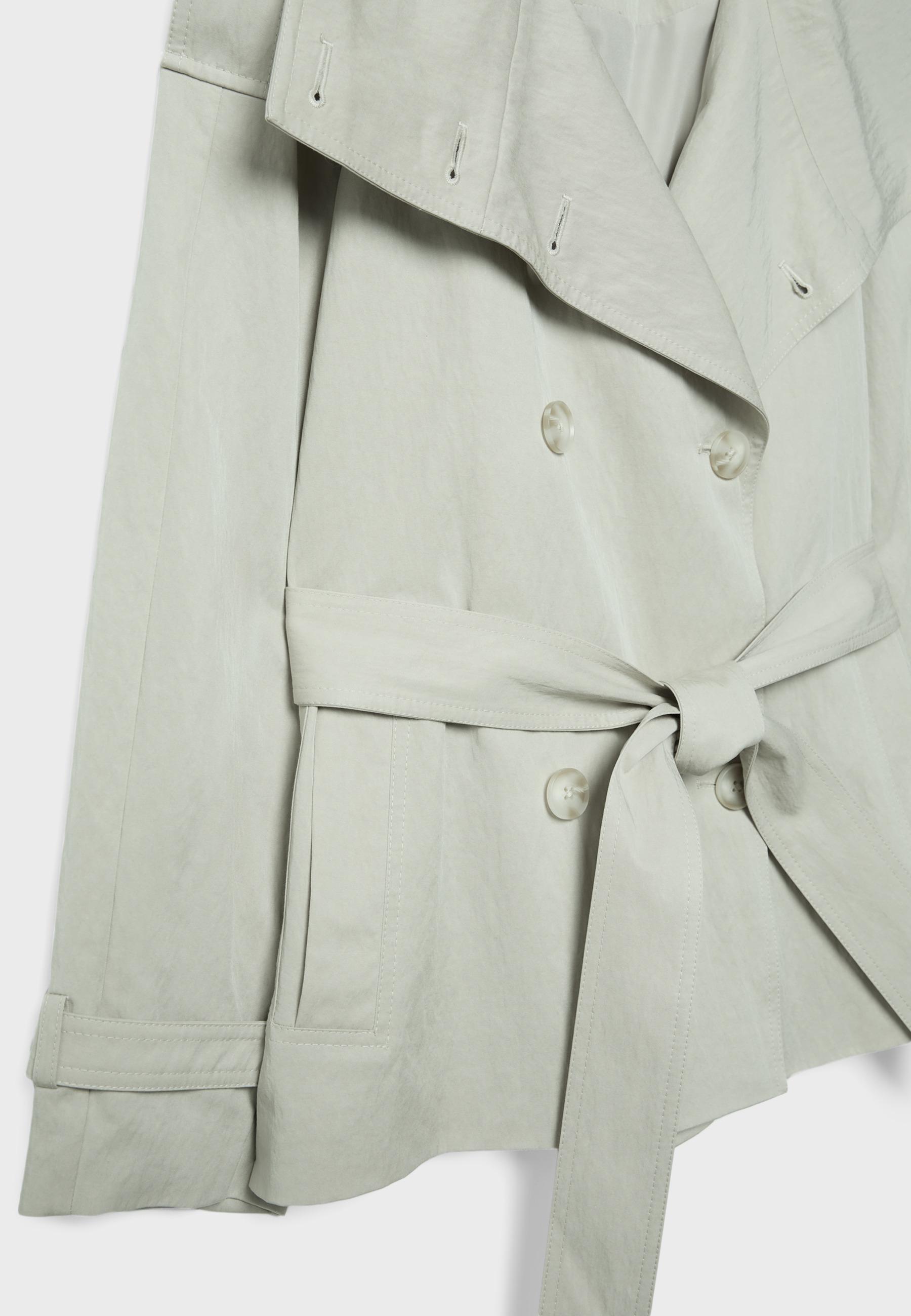 Dik yaka, uzun kollu, manşetleri bant ve düğme detaylı kısa trençkot. Yan cepler. Önü kruvaze düğmeli ve aynı renk kemerli. Farklı renklerde mevcuttur.