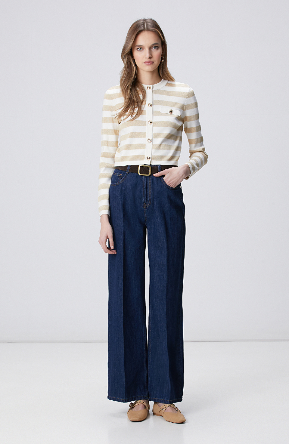 Ajurlu **Ipekyol** triko ile **Stradivarius** siyah geniş paça pantolonun minimalist uyumu — üzerine **Network** süet sneaker tamamlıyor.