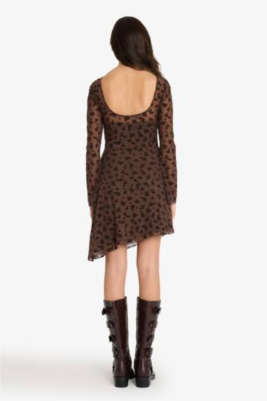 Kayık Yaka Dantel Detaylı Tül Uzun Kollu Mini Elbise