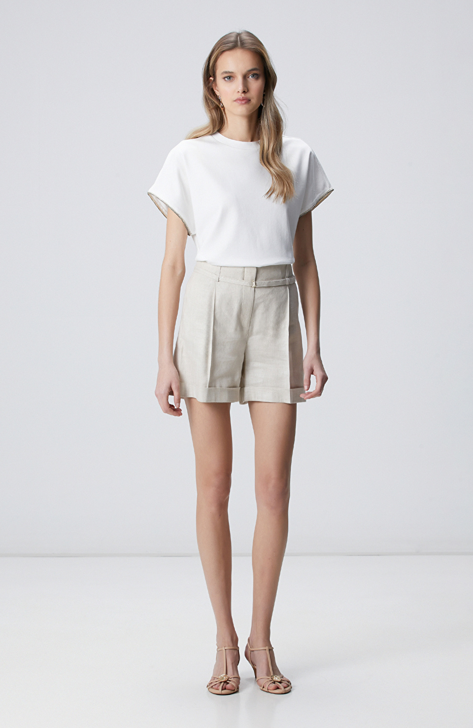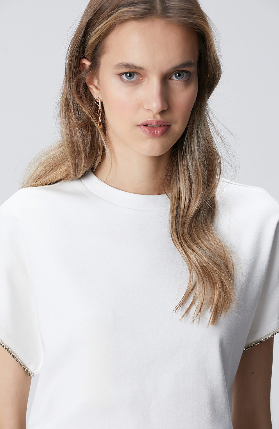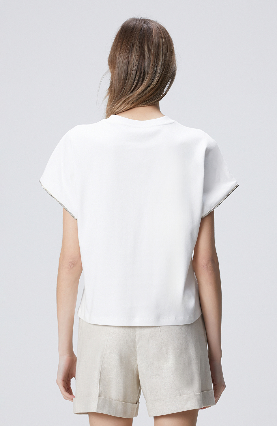 Kırık Beyaz Kol Ucu Taş Detaylı T-shirt